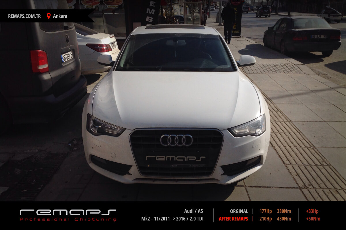 Audi A5 model dizel aracınızın ürettiği 177hp / 380nm motor gücünü, Türkiye normlarında verimli hale getirmek adına hazırladıgımız chip tuning (ecu) yazılım uygulaması sonrasında, 210hp / 430nm ’lik performans artışı öngörmekteyiz. Kazanılan + 33hp / + 50nm güç artışı sonrasında kesinlike çevreye rahatsızlık vermeyecek (duman atmayacak) şekilde eksoz emisyon değerleriniz korunarak hazırlanmaktadır.