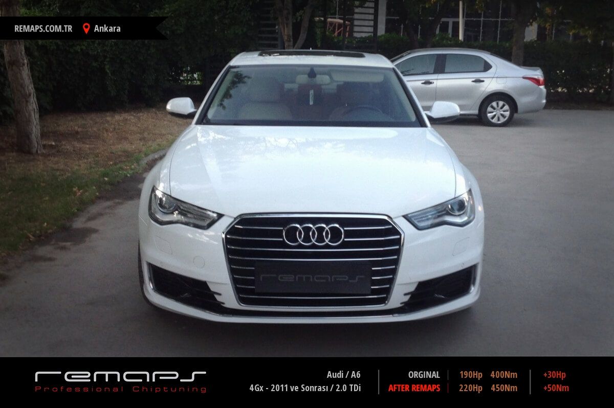 Audi A6 model dizel aracınızın ürettiği 190hp / 400nm motor gücünü, Türkiye normlarında verimli hale getirmek adına hazırladıgımız chip tuning (ecu) yazılım uygulaması sonrasında, 220hp / 450nm ’lik performans artışı öngörmekteyiz. Kazanılan + 30hp / + 50nm güç artışı sonrasında kesinlike çevreye rahatsızlık vermeyecek (duman atmayacak) şekilde eksoz emisyon değerleriniz korunarak hazırlanmaktadır.