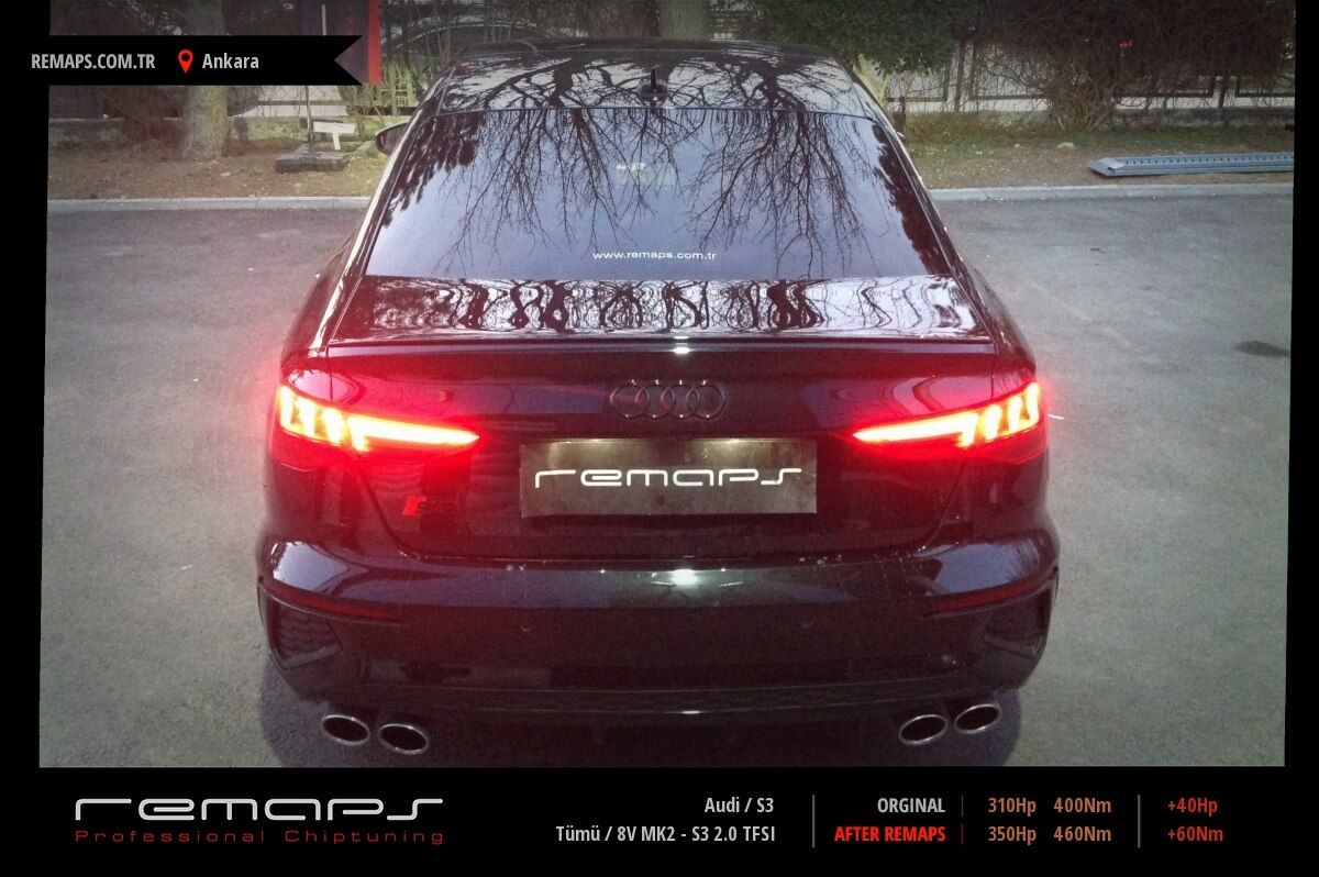 Audi S3 model benzinli aracınızın ürettiği 310hp / 400nm motor gücünü, Türkiye normlarında hazırladığımız chip tuning (ecu) yazılım uygulaması sonrasında, 350hp / 460nm ’lik performansa ulaşmasını sağlamaktayız. Kazanılan +40hp / + 60nm güç artışı sonrasında aracınızın egzoz emisyon değerleri kesinlikle değişmemekte ve duman atmamaktadır.