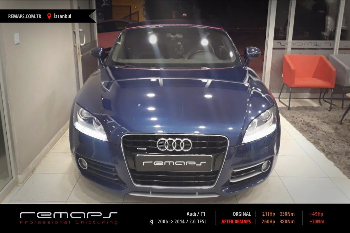 Audi TT model benzinli aracınızın ürettiği 211hp / 350nm motor gücünü, Türkiye normlarında hazırladığımız chip tuning (ecu) yazılım uygulaması sonrasında, 260hp / 380nm ’lik performansa ulaşmasını sağlamaktayız. Kazanılan +49hp / + 30nm güç artışı sonrasında aracınızın egzoz emisyon değerleri kesinlikle değişmemekte ve duman atmamaktadır.