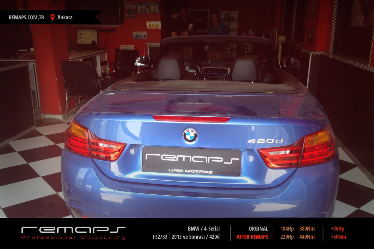 BMW 4-Serisi model dizel aracınızın ürettiği 184hp / 380nm motor gücünü, Türkiye normlarında verimli hale getirmek adına hazırladıgımız chip tuning (ecu) yazılım uygulaması sonrasında, 220hp / 440nm ’lik performans artışı öngörmekteyiz. Kazanılan + 36hp / + 60nm güç artışı sonrasında kesinlike çevreye rahatsızlık vermeyecek (duman atmayacak) şekilde eksoz emisyon değerleriniz korunarak hazırlanmaktadır.