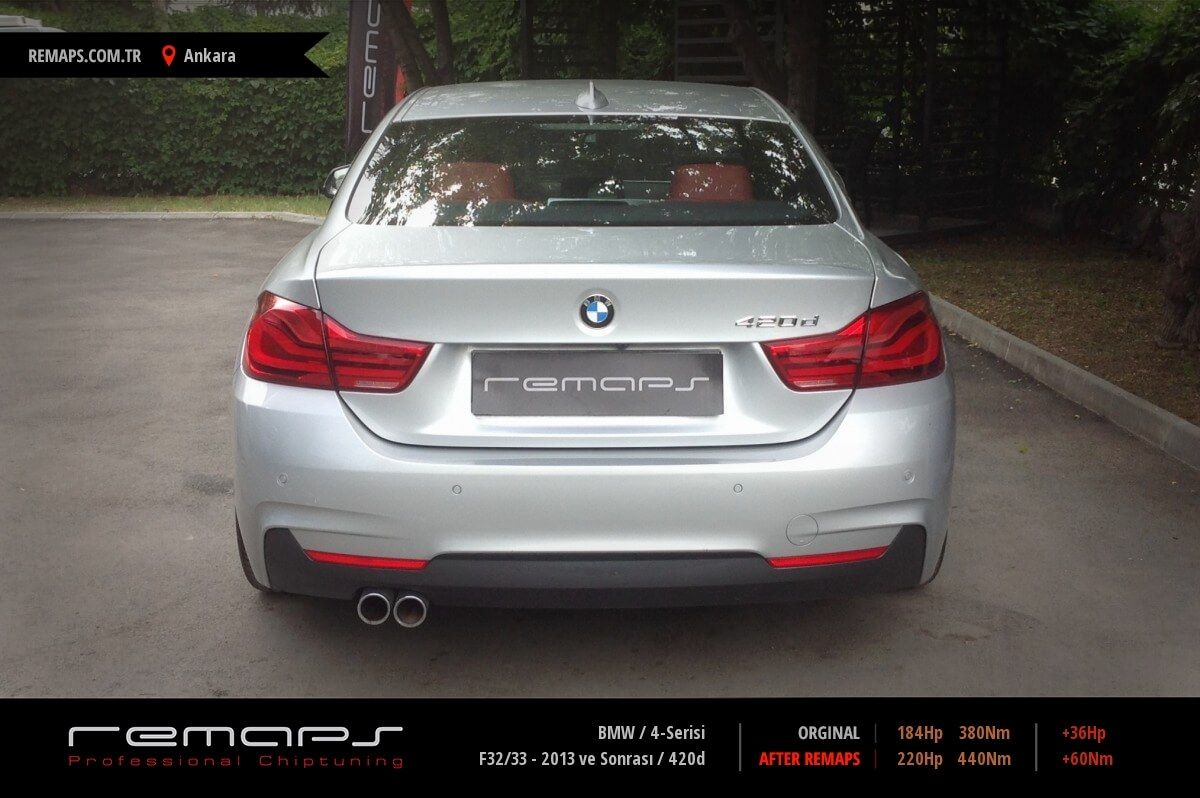 BMW 4-Serisi model dizel aracınızın ürettiği 184hp / 380nm motor gücünü, Türkiye normlarında verimli hale getirmek adına hazırladıgımız chip tuning (ecu) yazılım uygulaması sonrasında, 220hp / 440nm ’lik performans artışı öngörmekteyiz. Kazanılan + 36hp / + 60nm güç artışı sonrasında kesinlike çevreye rahatsızlık vermeyecek (duman atmayacak) şekilde eksoz emisyon değerleriniz korunarak hazırlanmaktadır.