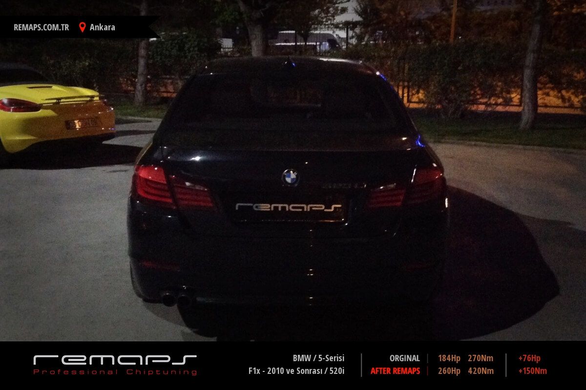 BMW 5-Serisi model benzinli aracınızın ürettiği 184hp / 270nm motor gücünü, Türkiye normlarında hazırladığımız chip tuning (ecu) yazılım uygulaması sonrasında, 260hp / 420nm ’lik performansa ulaşmasını sağlamaktayız. Kazanılan +76hp / + 150nm güç artışı sonrasında aracınızın egzoz emisyon değerleri kesinlikle değişmemekte ve duman atmamaktadır.