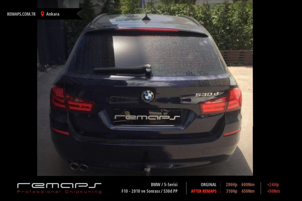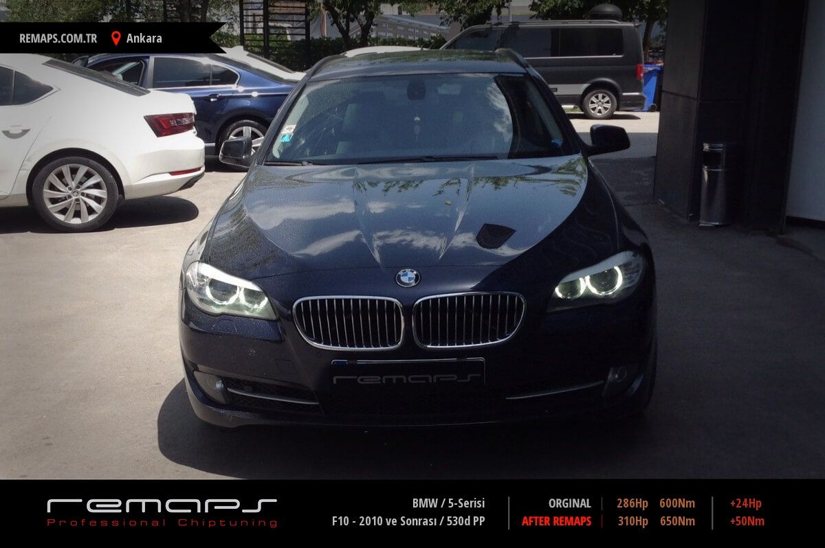 BMW 5-Serisi model dizel aracınızın ürettiği 286hp / 600nm motor gücünü, Türkiye normlarında verimli hale getirmek adına hazırladıgımız chip tuning (ecu) yazılım uygulaması sonrasında, 310hp / 650nm ’lik performans artışı öngörmekteyiz. Kazanılan + 24hp / + 50nm güç artışı sonrasında kesinlike çevreye rahatsızlık vermeyecek (duman atmayacak) şekilde eksoz emisyon değerleriniz korunarak hazırlanmaktadır.