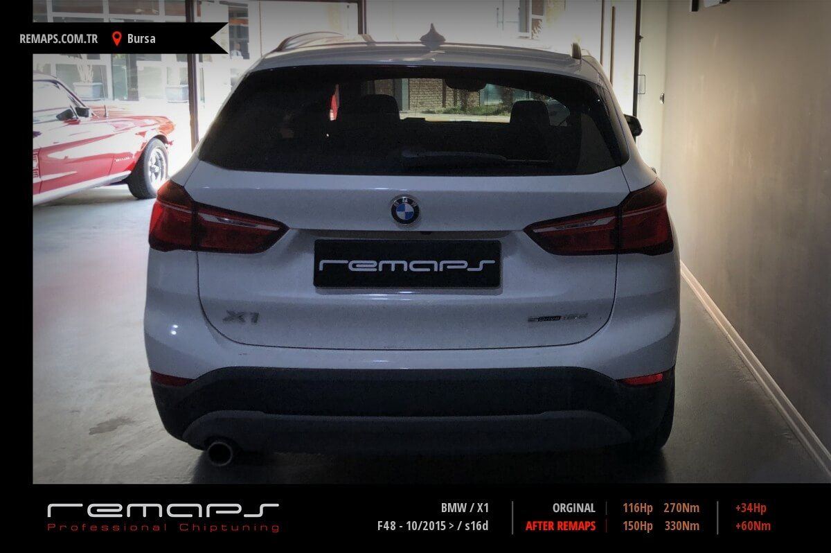 BMW X1 model dizel aracınızın ürettiği 116hp / 270nm motor gücünü, Türkiye normlarında verimli hale getirmek adına hazırladıgımız chip tuning (ecu) yazılım uygulaması sonrasında, 150hp / 330nm ’lik performans artışı öngörmekteyiz. Kazanılan + 34hp / + 60nm güç artışı sonrasında kesinlike çevreye rahatsızlık vermeyecek (duman atmayacak) şekilde eksoz emisyon değerleriniz korunarak hazırlanmaktadır.