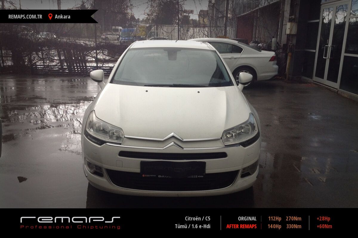 Citroën C5 model dizel aracınızın ürettiği 112hp / 270nm motor gücünü, Türkiye normlarında verimli hale getirmek adına hazırladıgımız chip tuning (ecu) yazılım uygulaması sonrasında, 140hp / 330nm ’lik performans artışı öngörmekteyiz. Kazanılan + 28hp / + 60nm güç artışı sonrasında kesinlike çevreye rahatsızlık vermeyecek (duman atmayacak) şekilde eksoz emisyon değerleriniz korunarak hazırlanmaktadır.