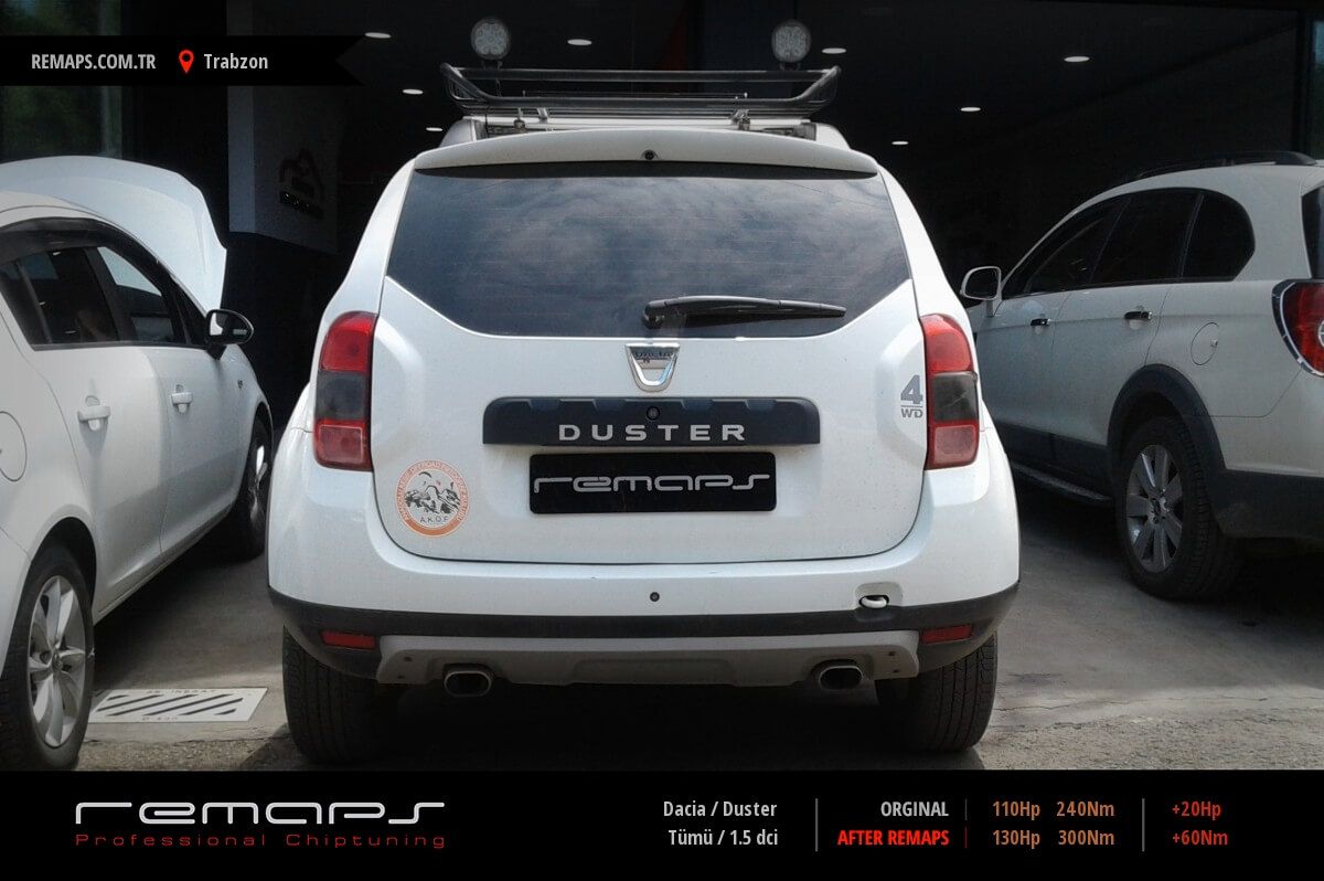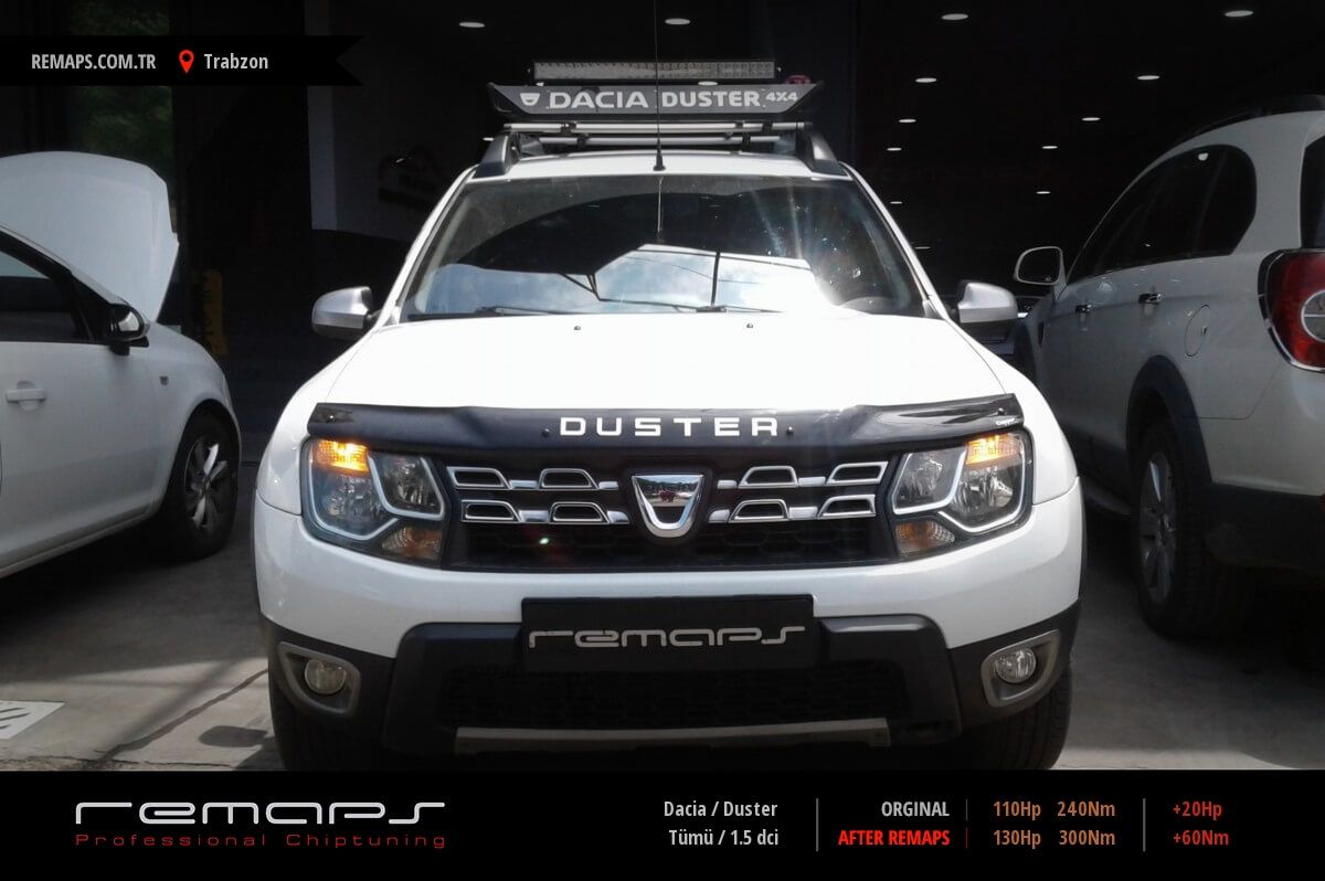 Dacia Duster model dizel aracınızın ürettiği 110hp / 240nm motor gücünü, Türkiye normlarında verimli hale getirmek adına hazırladıgımız chip tuning (ecu) yazılım uygulaması sonrasında, 130hp / 300nm ’lik performans artışı öngörmekteyiz. Kazanılan + 20hp / + 60nm güç artışı sonrasında kesinlike çevreye rahatsızlık vermeyecek (duman atmayacak) şekilde eksoz emisyon değerleriniz korunarak hazırlanmaktadır.