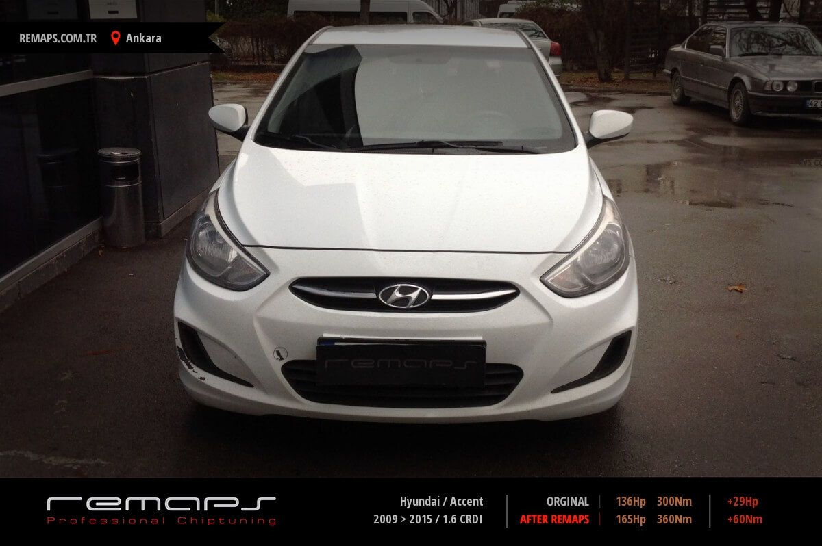 Hyundai Accent model dizel aracınızın ürettiği 136hp / 300nm motor gücünü, Türkiye normlarında verimli hale getirmek adına hazırladıgımız chip tuning (ecu) yazılım uygulaması sonrasında, 165hp / 360nm ’lik performans artışı öngörmekteyiz. Kazanılan + 29hp / + 60nm güç artışı sonrasında kesinlike çevreye rahatsızlık vermeyecek (duman atmayacak) şekilde eksoz emisyon değerleriniz korunarak hazırlanmaktadır.