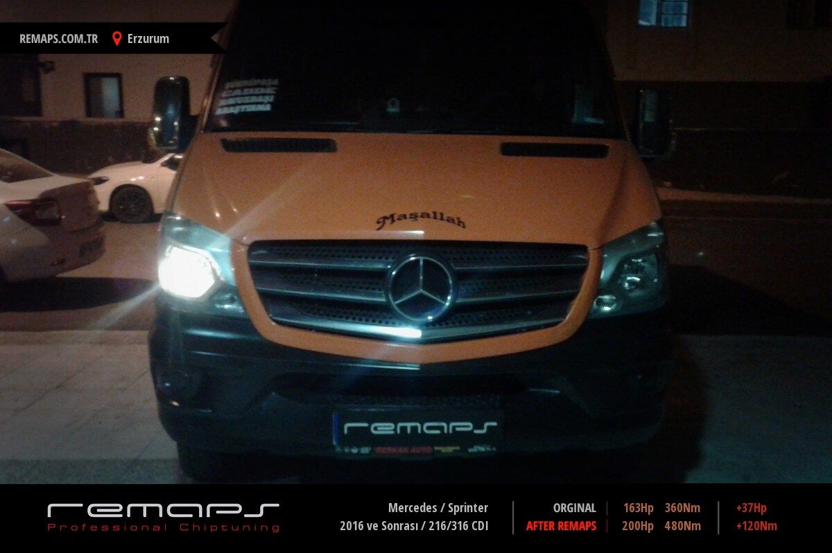 Mercedes Sprinter model dizel aracınızın ürettiği 163hp / 360nm motor gücünü, Türkiye normlarında verimli hale getirmek adına hazırladıgımız chip tuning (ecu) yazılım uygulaması sonrasında, 200hp / 480nm ’lik performans artışı öngörmekteyiz. Kazanılan + 37hp / + 120nm güç artışı sonrasında kesinlike çevreye rahatsızlık vermeyecek (duman atmayacak) şekilde eksoz emisyon değerleriniz korunarak hazırlanmaktadır.