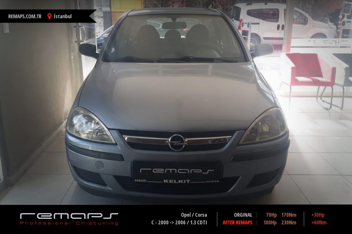 Opel Corsa model dizel aracınızın ürettiği 70hp / 170nm motor gücünü, Türkiye normlarında verimli hale getirmek adına hazırladıgımız chip tuning (ecu) yazılım uygulaması sonrasında, 100hp / 230nm ’lik performans artışı öngörmekteyiz. Kazanılan + 30hp / + 60nm güç artışı sonrasında kesinlike çevreye rahatsızlık vermeyecek (duman atmayacak) şekilde eksoz emisyon değerleriniz korunarak hazırlanmaktadır.