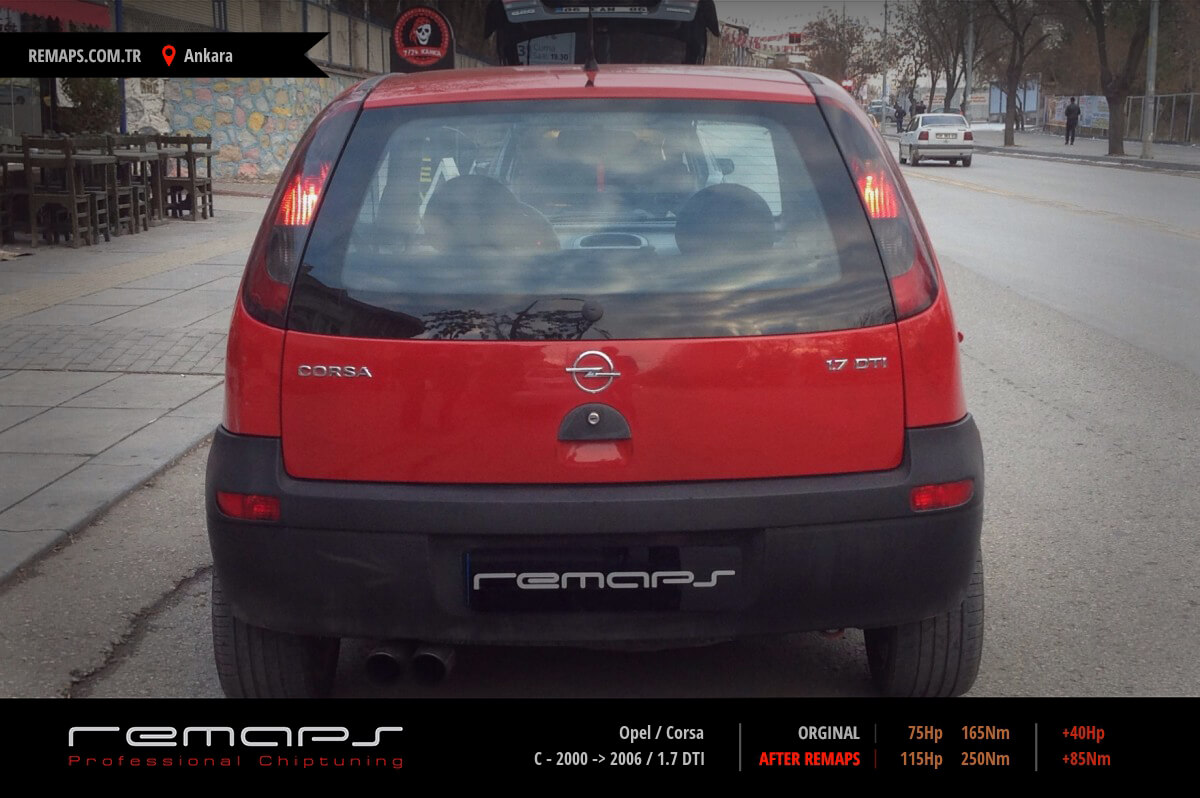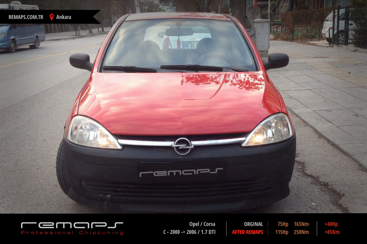 Opel Corsa model dizel aracınızın ürettiği 75hp / 165nm motor gücünü, Türkiye normlarında verimli hale getirmek adına hazırladıgımız chip tuning (ecu) yazılım uygulaması sonrasında, 115hp / 250nm ’lik performans artışı öngörmekteyiz. Kazanılan + 40hp / + 85nm güç artışı sonrasında kesinlike çevreye rahatsızlık vermeyecek şekilde eksoz emisyon değerleri korunarak hazırlanmaktadır.