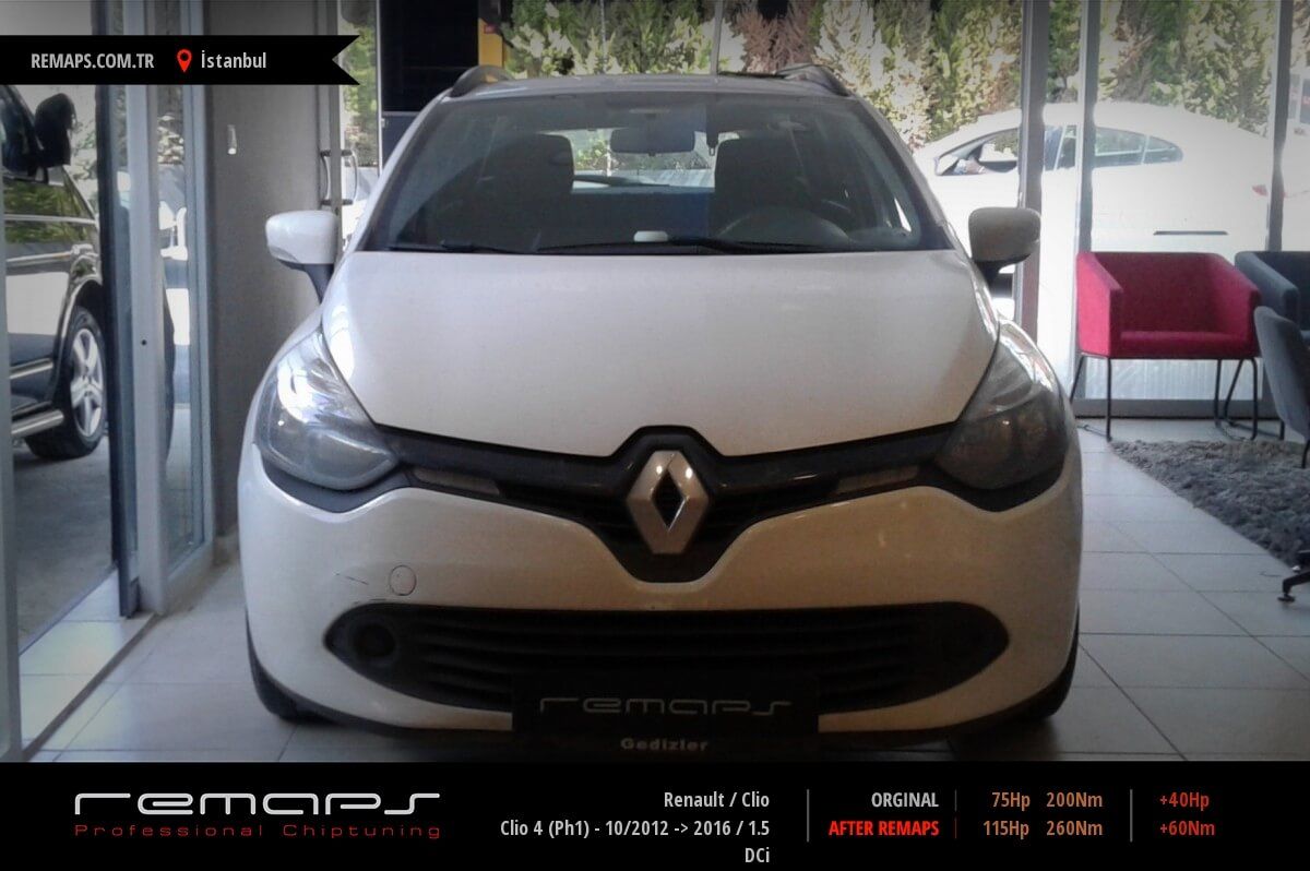 Renault Clio model dizel aracınızın ürettiği 75hp / 200nm motor gücünü, Türkiye normlarında verimli hale getirmek adına hazırladıgımız chip tuning (ecu) yazılım uygulaması sonrasında, 115hp / 260nm ’lik performans artışı öngörmekteyiz. Kazanılan + 40hp / + 60nm güç artışı sonrasında kesinlike çevreye rahatsızlık vermeyecek (duman atmayacak) şekilde eksoz emisyon değerleriniz korunarak hazırlanmaktadır.