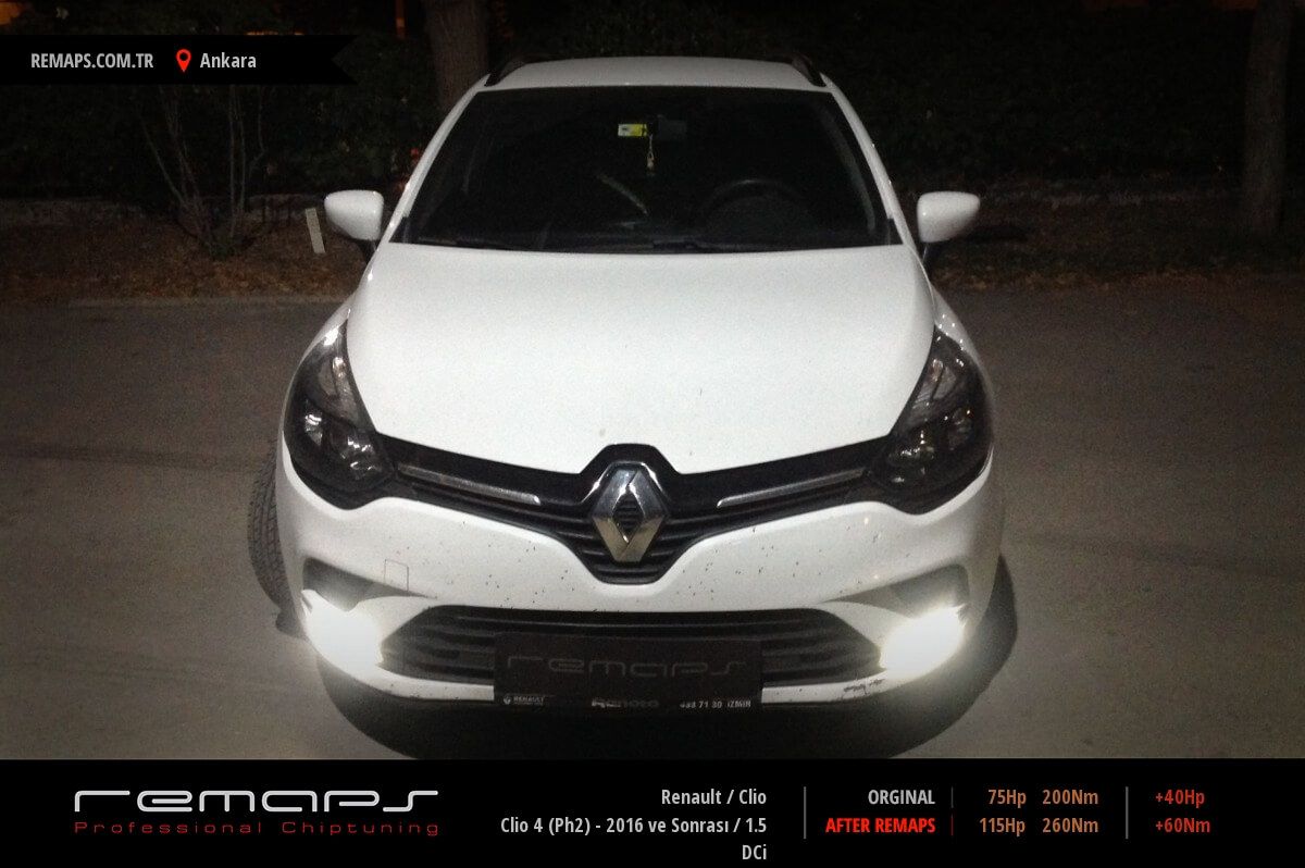 Renault Clio model dizel aracınızın ürettiği 75hp / 200nm motor gücünü, Türkiye normlarında verimli hale getirmek adına hazırladıgımız chip tuning (ecu) yazılım uygulaması sonrasında, 115hp / 260nm ’lik performans artışı öngörmekteyiz. Kazanılan + 40hp / + 60nm güç artışı sonrasında kesinlike çevreye rahatsızlık vermeyecek (duman atmayacak) şekilde eksoz emisyon değerleriniz korunarak hazırlanmaktadır.