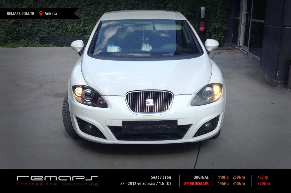 Seat Leon model dizel aracınızın ürettiği 110hp / 250nm motor gücünü, Türkiye normlarında verimli hale getirmek adına hazırladıgımız chip tuning (ecu) yazılım uygulaması sonrasında, 145hp / 310nm ’lik performans artışı öngörmekteyiz. Kazanılan + 35hp / + 60nm güç artışı sonrasında kesinlike çevreye rahatsızlık vermeyecek (duman atmayacak) şekilde eksoz emisyon değerleriniz korunarak hazırlanmaktadır.