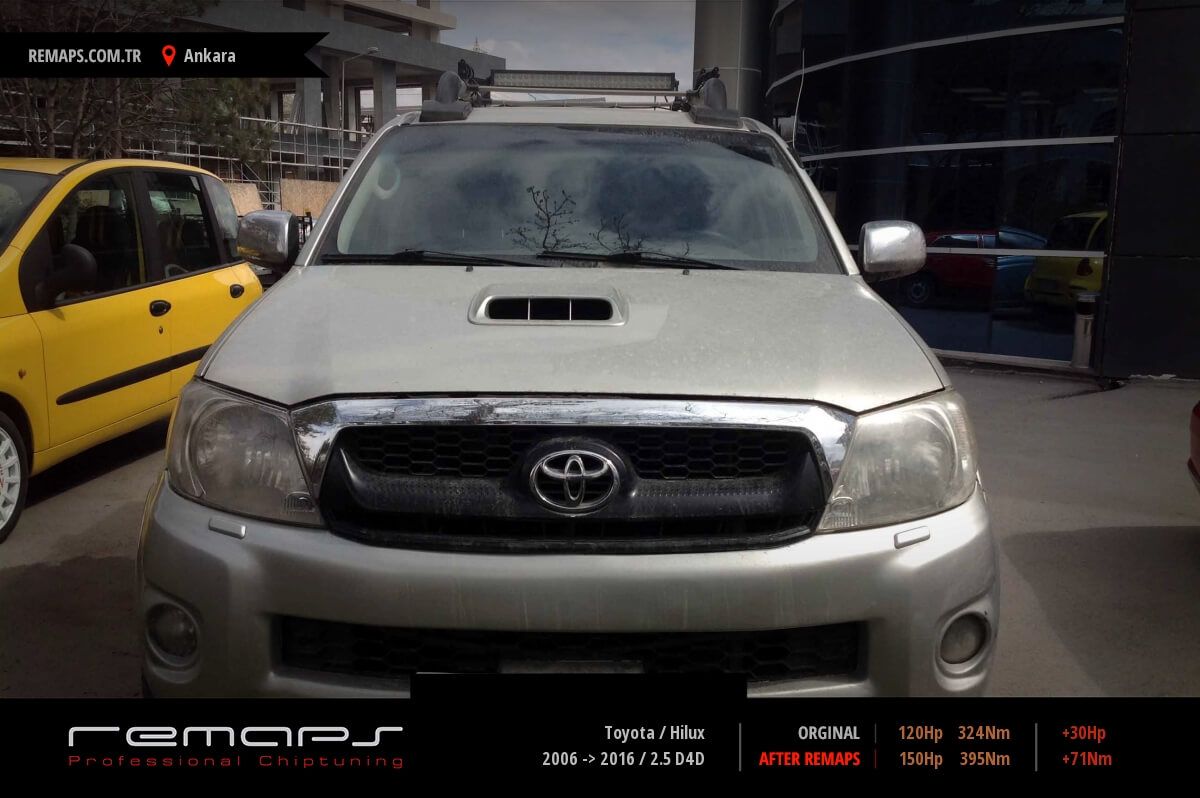 Toyota Hilux model dizel aracınızın ürettiği 120hp / 324nm motor gücünü, Türkiye normlarında verimli hale getirmek adına hazırladıgımız chip tuning (ecu) yazılım uygulaması sonrasında, 150hp / 395nm ’lik performans artışı öngörmekteyiz. Kazanılan + 30hp / + 71nm güç artışı sonrasında kesinlike çevreye rahatsızlık vermeyecek (duman atmayacak) şekilde eksoz emisyon değerleriniz korunarak hazırlanmaktadır.