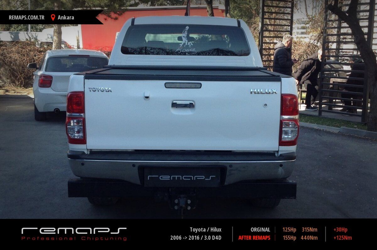 Toyota Hilux model dizel aracınızın ürettiği 125hp / 315nm motor gücünü, Türkiye normlarında verimli hale getirmek adına hazırladıgımız chip tuning (ecu) yazılım uygulaması sonrasında, 155hp / 440nm ’lik performans artışı öngörmekteyiz. Kazanılan + 30hp / + 125nm güç artışı sonrasında kesinlike çevreye rahatsızlık vermeyecek (duman atmayacak) şekilde eksoz emisyon değerleriniz korunarak hazırlanmaktadır.