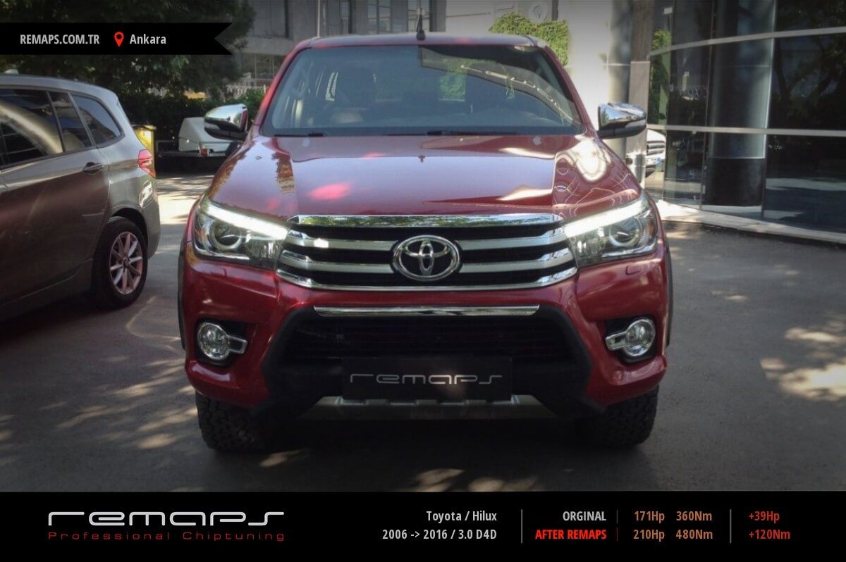 Toyota Hilux model dizel aracınızın ürettiği 171hp / 360nm motor gücünü, Türkiye normlarında verimli hale getirmek adına hazırladıgımız chip tuning (ecu) yazılım uygulaması sonrasında, 210hp / 480nm ’lik performans artışı öngörmekteyiz. Kazanılan + 39hp / + 120nm güç artışı sonrasında kesinlike çevreye rahatsızlık vermeyecek (duman atmayacak) şekilde eksoz emisyon değerleriniz korunarak hazırlanmaktadır.
