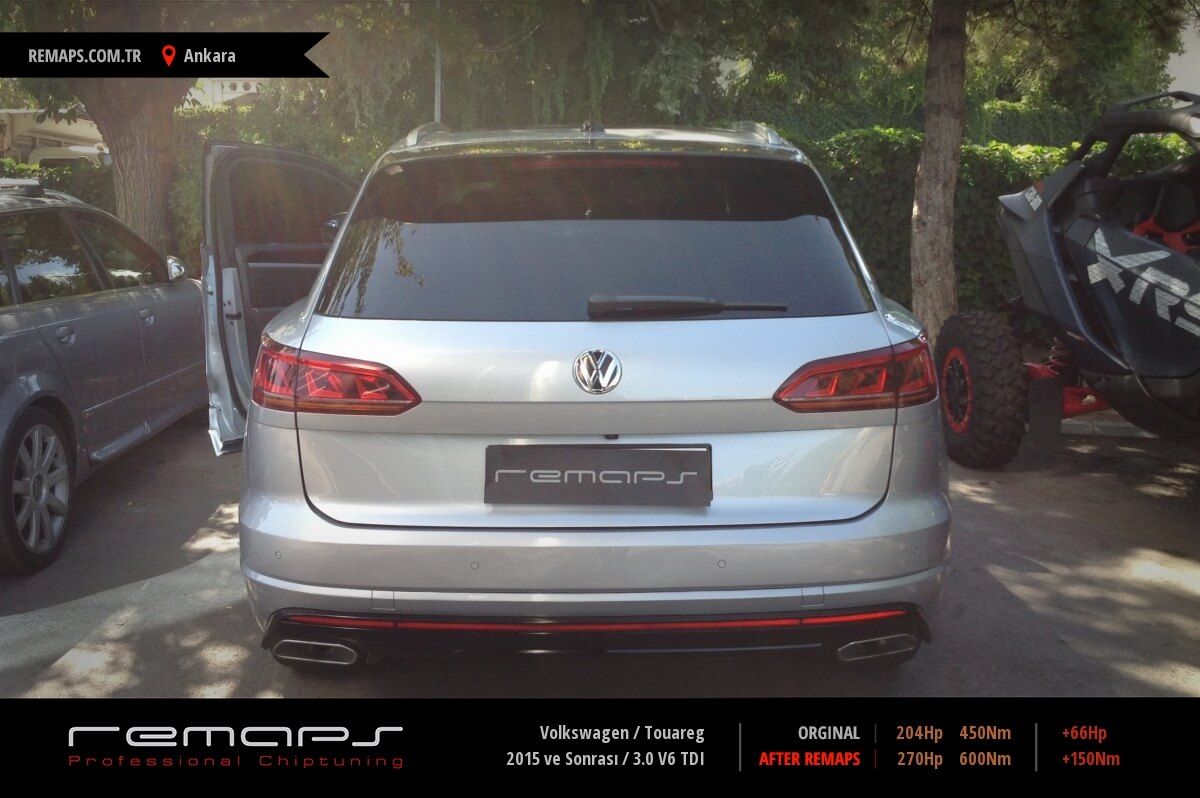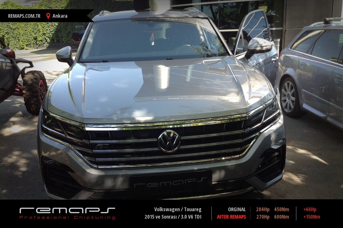 Volkswagen Touareg model dizel aracınızın ürettiği 204hp / 450nm motor gücünü, Türkiye normlarında verimli hale getirmek adına hazırladıgımız chip tuning (ecu) yazılım uygulaması sonrasında, 270hp / 600nm ’lik performans artışı öngörmekteyiz. Kazanılan + 66hp / + 150nm güç artışı sonrasında kesinlike çevreye rahatsızlık vermeyecek (duman atmayacak) şekilde eksoz emisyon değerleriniz korunarak hazırlanmaktadır.